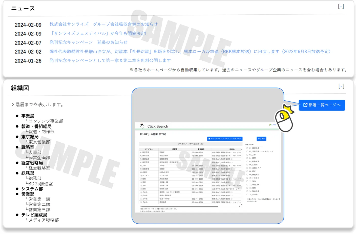 「企業情報」「ニュース」「組織図」「人事異動」「関連会社」「インボイス登録番号」が表示されるので、適宜詳細をご覧ください。